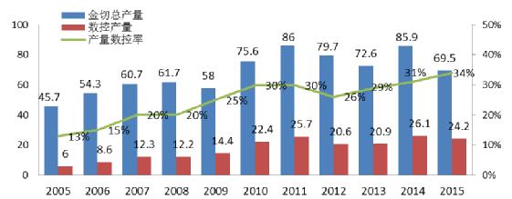 近年來中國(guó)機床 市場需求結(jié)構加快了變化的(de)速度,普通、低檔數(shù)控機床💛需💯求大幅(fú)度萎縮,大重型和(he)高檔數控機床仍(reng)保持🐉穩定需求👈。2015年(nián) 金切機床的産量(liàng) 同比下降19% ,數(shu)控金切機床産量(liang)24.2萬台、 同比下降 7 % ,産(chan)量數控化率逐年(nián)提升,保持增長态(tai)勢; 2005-201 5 年金切機床産(chan)量 如下圖,(單位:萬(wàn)台)